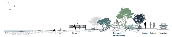 Som et led i realiseringen af den strategisk-fysiske udviklingsplan for Stege Kyst besluttede Kommunalbestyrelsen i starten af 2020, at en ny, udvidet badestrand skulle udgøre et åbningstræk for hele planen. Udvidelsen af stranden giver plads til et sikringsdige mod oversvømmelse fra havet der udover at have voldt store udfordringer de seneste år, er udset til at stige i fremtiden. Selve kystsikringen udgøres, udover en forhøjning af de eksisterende granitkanter, af et blødt dige, der snor sig igennem strandens grønne ryg ind mod parallelt liggende vejanlæg, der udover at sikre mod stormflod, skaber et værdifuldt rekreativt byrum for byens borgere og besøgende. Diget og området omkring den nye strand vil tage udgangspunkt i lokale fauna og arter. Stranden tænkes at blive realiseret etapevis i takt med at finansieringen sikres.