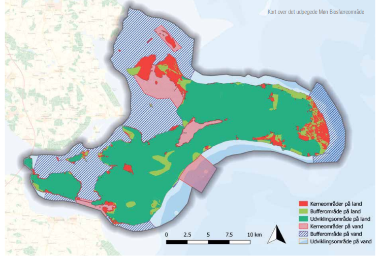 Biosfæreprogrammet er inddelt i tre zoner, kerne- buffer og udviklingsområder, hvor udpegninger af Grønt Danmarkskort, kulturmiljøer og særlige landskabelige værdier skal administreres restriktivt ved planlægning i områderne.