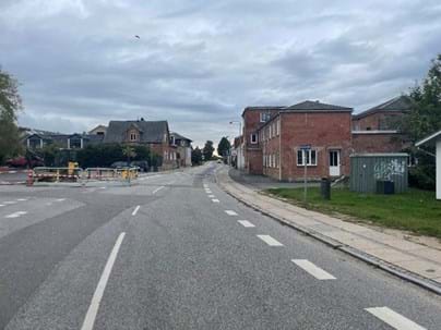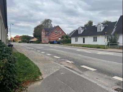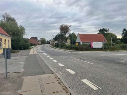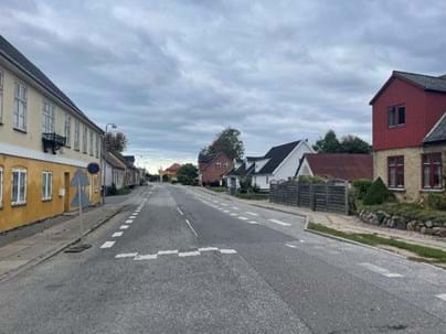 Billede af hovedgaden mod vest, her kan de sammenbyggede huse ses til venstre og de fritliggende huse til højre.