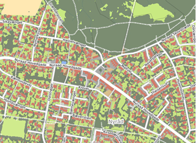 Illustration af fordelingen af grøn og bebyggede struktur omkring hovedgaden. Mørkegrøn viser høj beplantning og lysegrøn viser lav beplantning.
