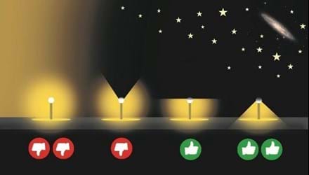 - Undgå blænding, brug lamper som afskærmer lyskilden og installer lamperne så de ikke blænder. Meget lidt, eller intet blåt lys, brug lyskilder som er mærket Varmhvid med en lysfarve på 3000K eller mindre.