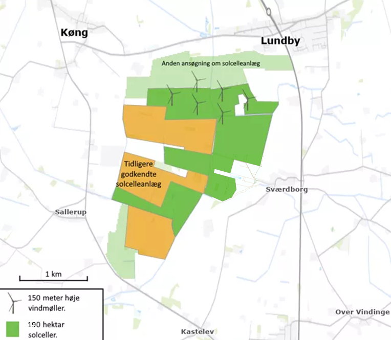 Projektet omfatter 6 vindmøller på 150 meters højde og et areal på 210 ha til solceller. Der er i området tidligere godkendt arealer til 165 ha solceller i området.