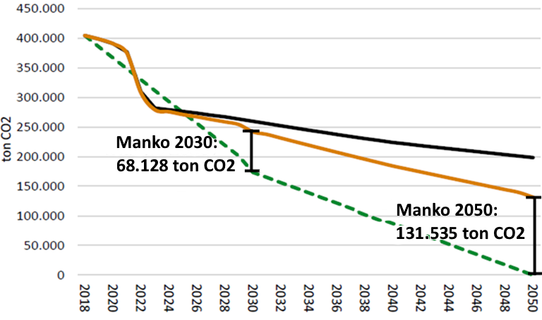 På basis af Vordingborg Kommunes fremtidige indsatser (link) er der udarbejdet en fremskrivning af CO2-udledningen, så vi kan se hvor langt vi er fra målsætningerne for 2030 og 2050. Den manglende reduktion i udledningerne benævnes ”Manko”