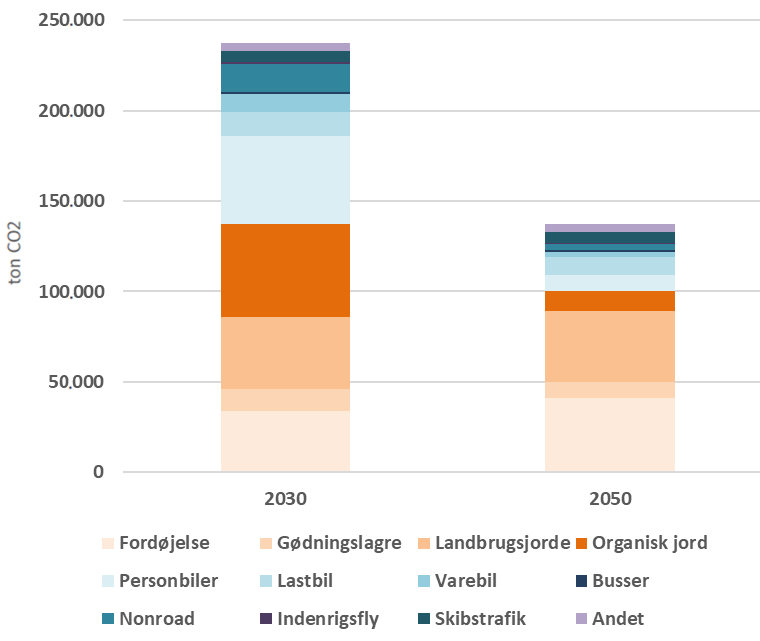I fremskrivningen mangler der en reduktion på 131.535 ton CO2 i 2050. Udledningerne i 2050 forventes primært at komme fra landbrugsområdet, og forventes for hovedparten reduceret på baggrund af statslige indsatser. Transportområdet vil fortsat rumme en del udledninger, hvilket skal håndteres gennem yderligere teknologiske fremskridt eller gennem CO2-lagring i et omfang der svarer til den fortsatte udledning.