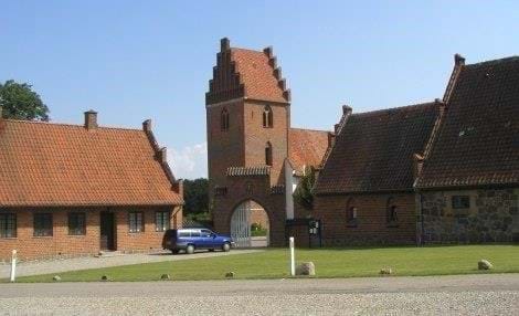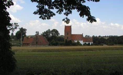 Fint indblik fra syd og vest. Fra alléen er indblikket specielt flot, da man kigger ned på kirkeanlægget.