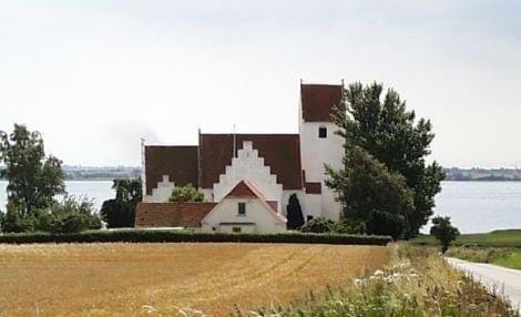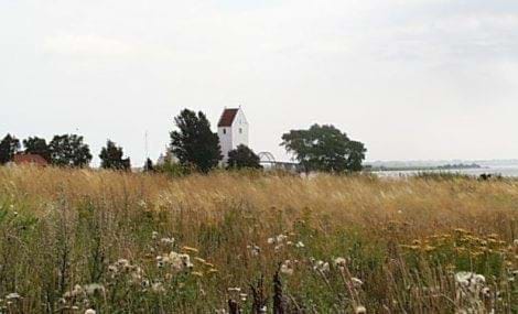 Fra Dronning Alexandrines bro mellem Møn og Sjælland kan kirken opleves fra stor afstand.