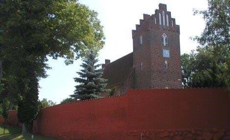 Kirken er højt placeret syd for en befærdet vej. Kirkens markante røde kirkegårdsmur gør anlægget meget tydeligt i de nærmeste omgivelser, men muren afskærer samtidig for en integration af kirke og landsby.