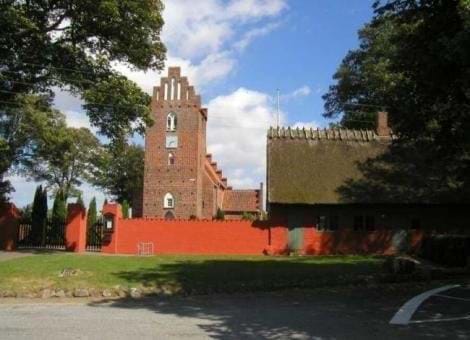 Kirken og den fredede kirkelade ligger ud til pladsen foran den senromanske teglstenskirke. Kirkeladen indgår som en del af kirkemuren.
