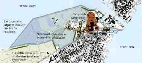 Sukkerfabrikkens store bygninger dominerer Lendemarke. Siloer og skorstene stikker op og blander sig i gadebilledet - også ovre i Stege.