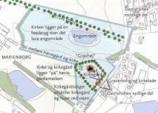 Damsholte kirke ligger højt i landskabet med et lavt engareal og åbne marker omkring sig. Marienborgs jorder er skåret ud til kirken, og sammenhængen mellem herregård og kirke er da også tæt, historisk set.