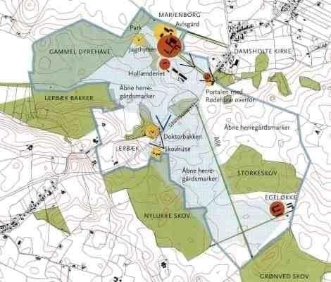 Landskabet omkring Marienborg Gods er meget varieret og veksler mellem skov, park, mose, mark og eng. Flere af godsets ejendomme er lagt i skovbrynene.