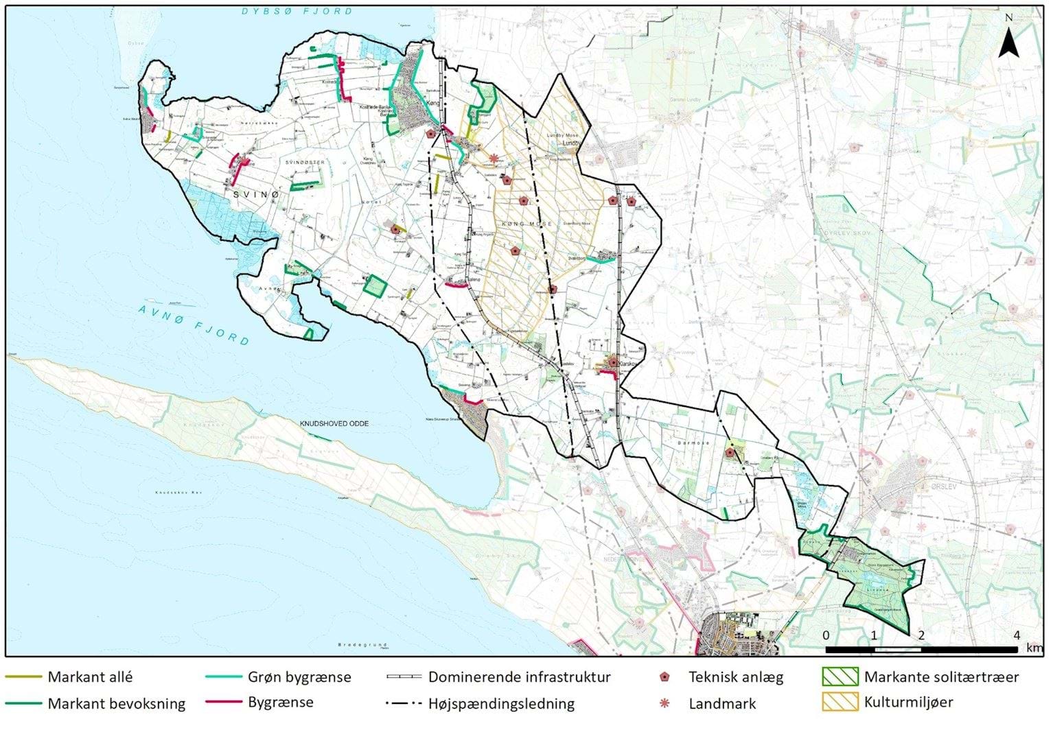 Den vestlige del af området, selve halvøen Svinø, fremstår uden tekniske anlæg som sådan, der er dog landbrug, som i bygningsmasse har udviklet sig med større siloer m.m. De tekniske anlæg ses koncentreret i et nord-sydgående bånd vest for Sydbanen, som i sig selv er dominerende infrastruktur. Elektrificeringen af jernbanen med etablering af køreledninger forstærker det tekniske udtryk og har bevirket at jernbanebroer er forhøjede, med deraf affødt behov for mere omfattende terrænopbygning ved broernes vejanlæg. Vest for jernbanen løber hovedvejen mellem Vordingborg og Næstved med høje trafiktal, og mellem de to betydelige trafikårer, er landskabet i Køng Mose præget af to vindmøllegrupper. To tracéer af højspændingsledninger gennemskærer denne del af området fra nord til syd, og området ved Barmosen og Ørslev Mose gennemskæres også af luftledninger. Barmosen rummer desuden et fritidsområde til støjende aktiviteter med større volde og der er lokalplanlagt for en solcellepark.