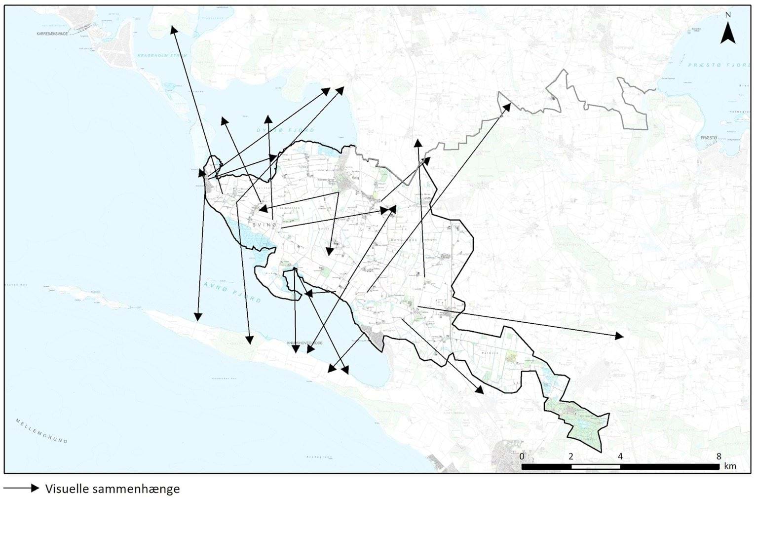 Fra kyststrækninger mod syd og nord, og fra høje punkter i dødislandskabet på den vestligste del af Svinø, er god kontakt til modstående kyststrækninger. Dette gælder mod nord over Dybsø Fjord til Næstved Kommune, og mod syd over Avnø Fjord til Knudshoved Odde, der er en del af område 12 Rosenfeldt godslandskab.
