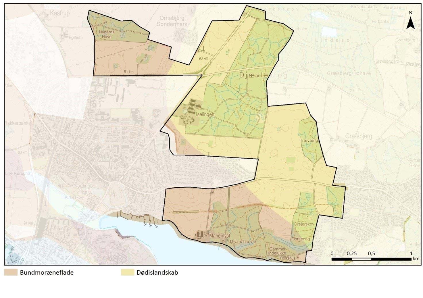 Terrænet er således i den østlige del småbakket uden egentlig retning, dog med områdets højeste bakker på omkring 40 moh i området omkring Græsbjerg og herfra mere og mere jævnt bølgende faldende mod Nordhavn mod sydvest. Vest for Iselingen Gods og Københavnsvej findes et lavereliggende område i omkring kote 10-15, hvor der har været gravet tørv i de gamle dødishuller.