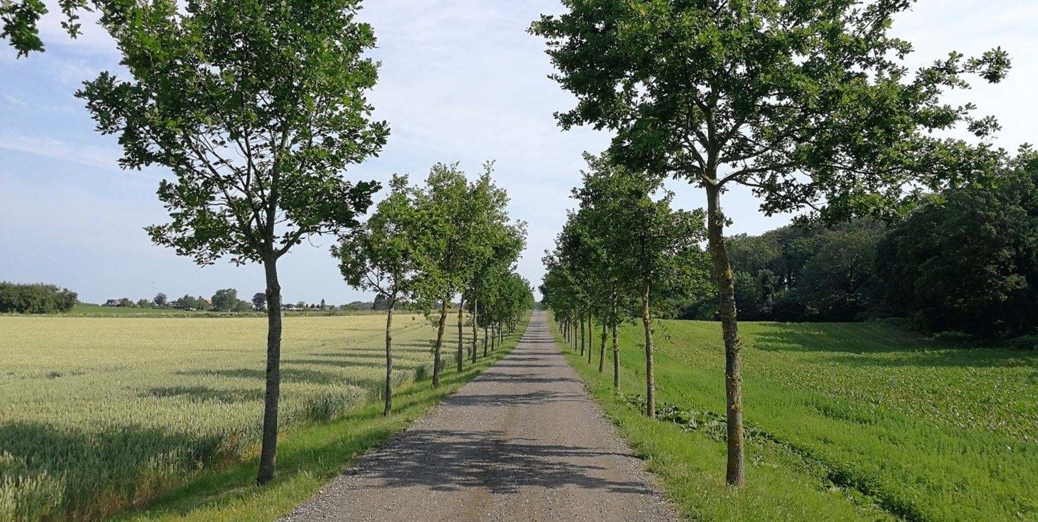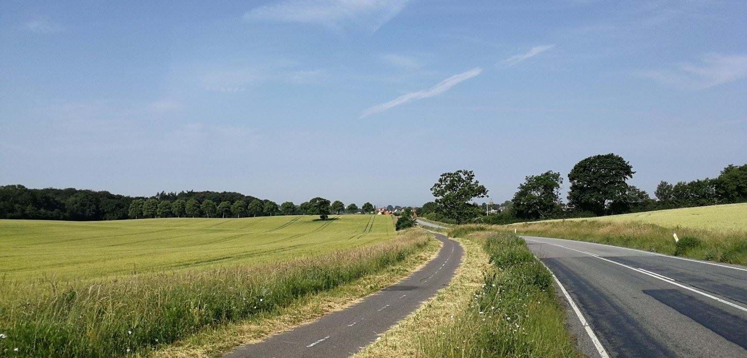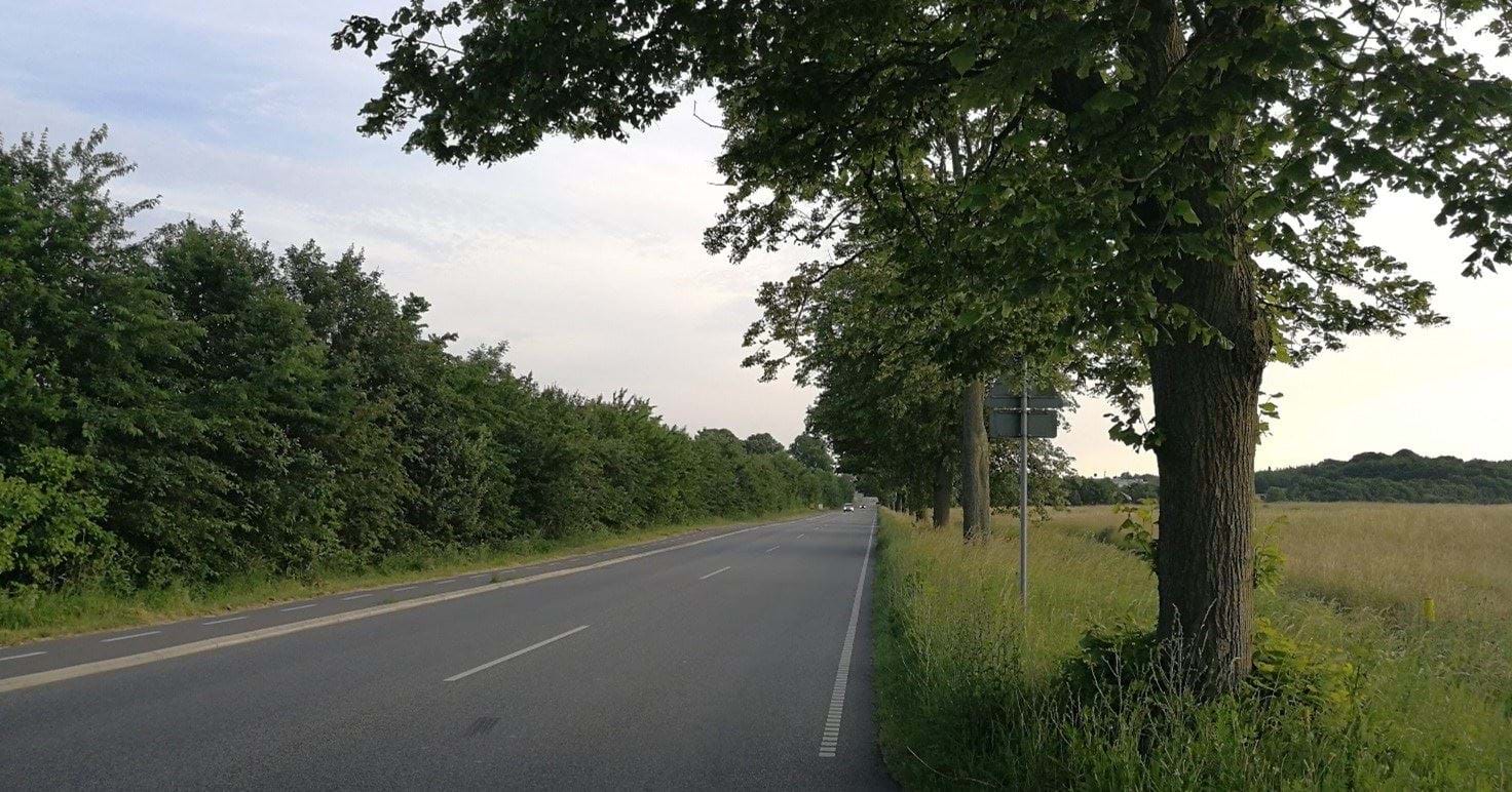 Københavnsvej mod Vordingborg. Iselingen Gods ligger th bag den skærmende beplantning.