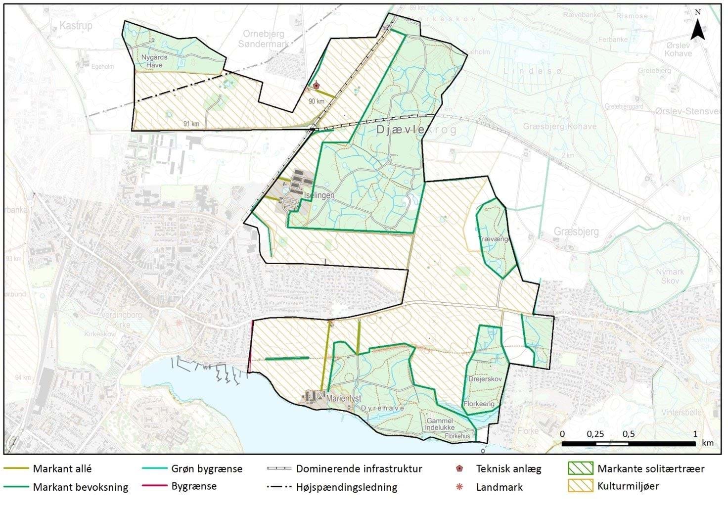 Det intensivt dyrkede landbrugslandskab brydes af en allé til jernbanetrinbrættet i Marienlystskoven og alléen til Marienlysts hovedbygning. Herudover er der gamle, blandede løvtræslæhegn i markskellene, særligt nord for Nyraadsvej.