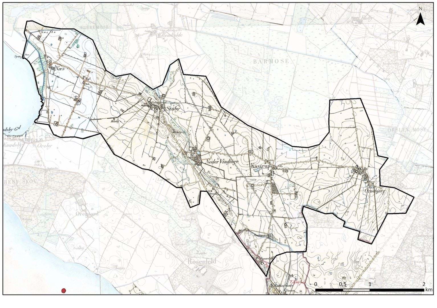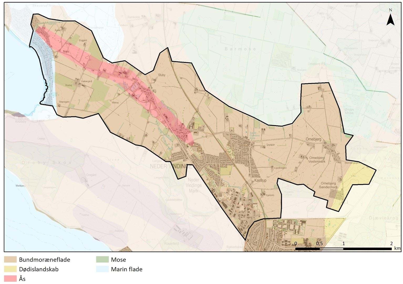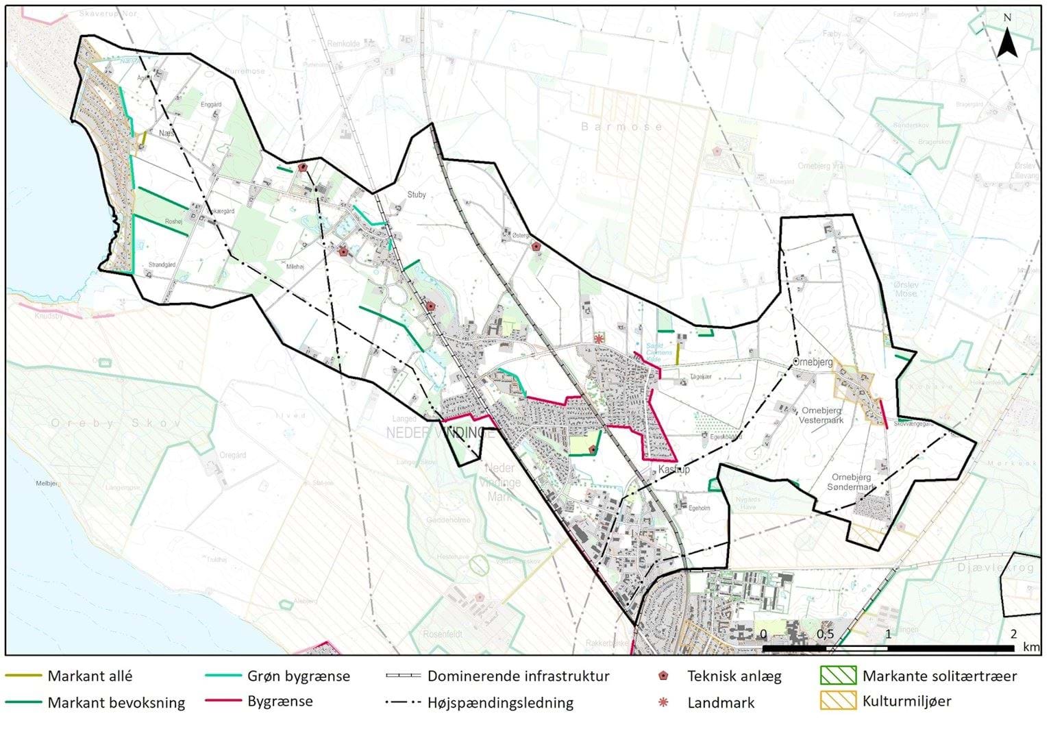Områdets bebyggelse består af 5 oprindelige landsbyer, Næs, Stuby, Neder Vindinge, Kastrup og Ornebjerg.