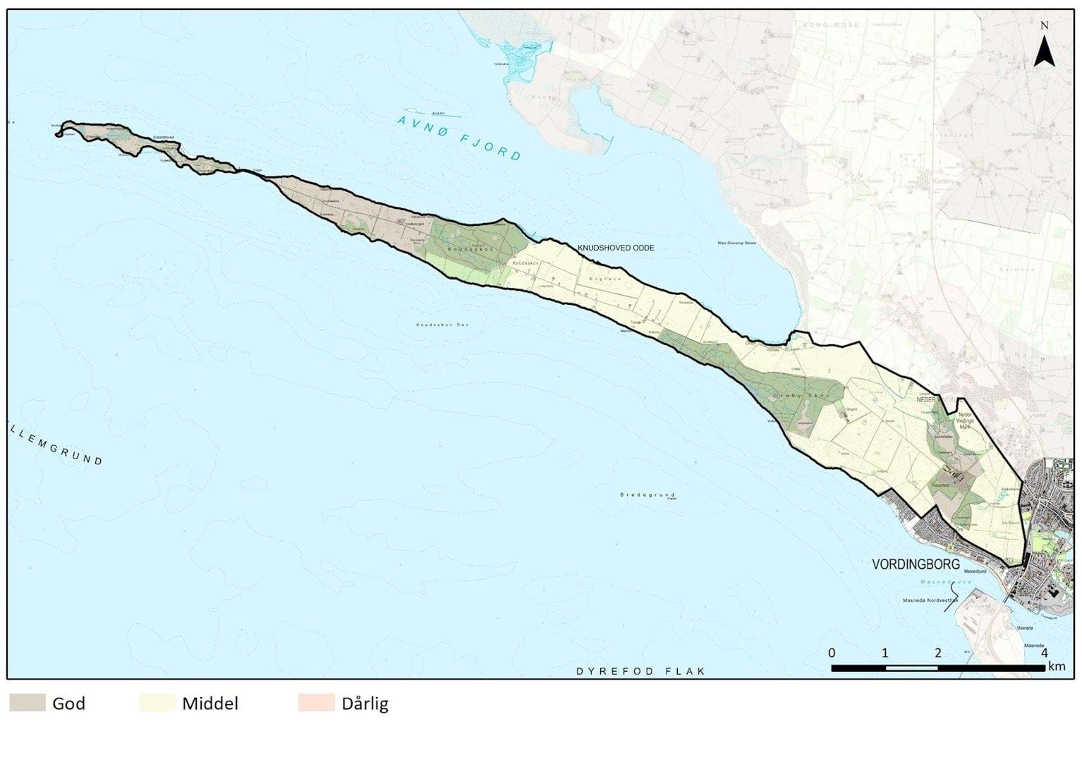 I den øvrige del af området er tilstanden middel. De bærende landskabselementer med skovbryn og kyststrækning samt de karakteristiske store marker står tydeligt. Men der er forsvundet stier, veje, levende hegn og bebyggelse, og der er sket en intensivering af markdrift, flere vådområder er blevet opdyrket. Landskabet er blevet mindre varieret end det var. Op mod Vordingborg By er området derimod blevet mere forstyrret og sammensat som følge af støjende infrastruktur, byfronter og højspændingsledninger. Alléen til Kuskeskov, som er et vigtigt landskabselement, er desuden i dårlig vedligeholdelsesmæssig tilstand.