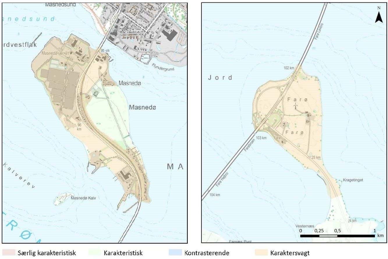 Landskabskarakterområde 13. transportkorridorøer Farø og Masnedø, fremstår pga. de altdominerende infrastrukturanlæg og den samfundsmæssige strukturudvikling meget karaktersvagt med en dårlig tilstand og intakthed i forhold til den kulturhistoriske oprindelse som øer med god bonitet, udstykket og dyrket som traditionelle, kystnære landbrugsområder.