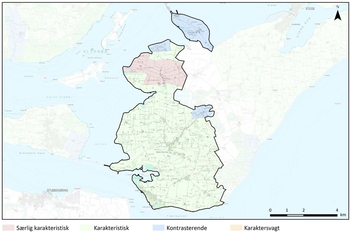 Kosterland: Kosterland opleves fladere, mere jævnt og mere åbent end størstedelen af landskabskarakterområdet. Samtidig er Koster landsby blevet stjerneudstykket i forbindelse med udskiftningen, hvilket står i kontrast til den resterende del af området.