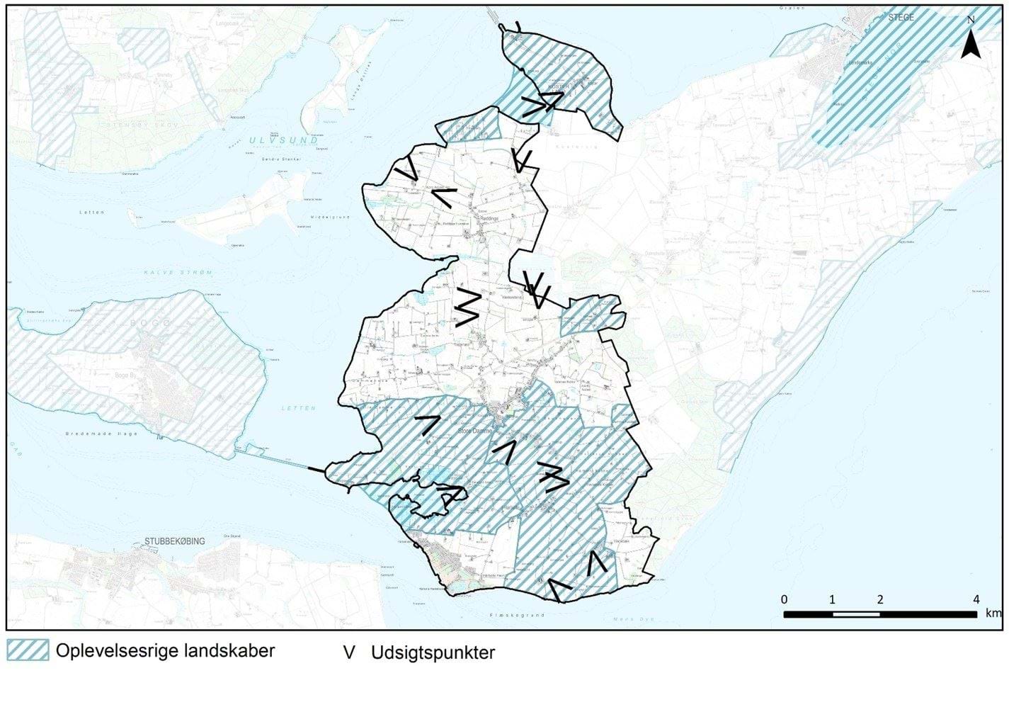 Kystlandskabet omkring Fanefjord og Letten: Området rummer mulighed for udsigt over Fanefjord og Maderne samt udsigt til Falster og Bogø. Terrænet i det oplevelsesrige område falder jævnt ned mod kysten. Området indeholder også Fanefjord Kirke og Grønsalen. Kystlandskabet omkring Fanefjord står i kontrast til den markante og højtliggende kirke. Området rummer også mulighed for indsigt til Fanefjord Kirke fra baglandet.