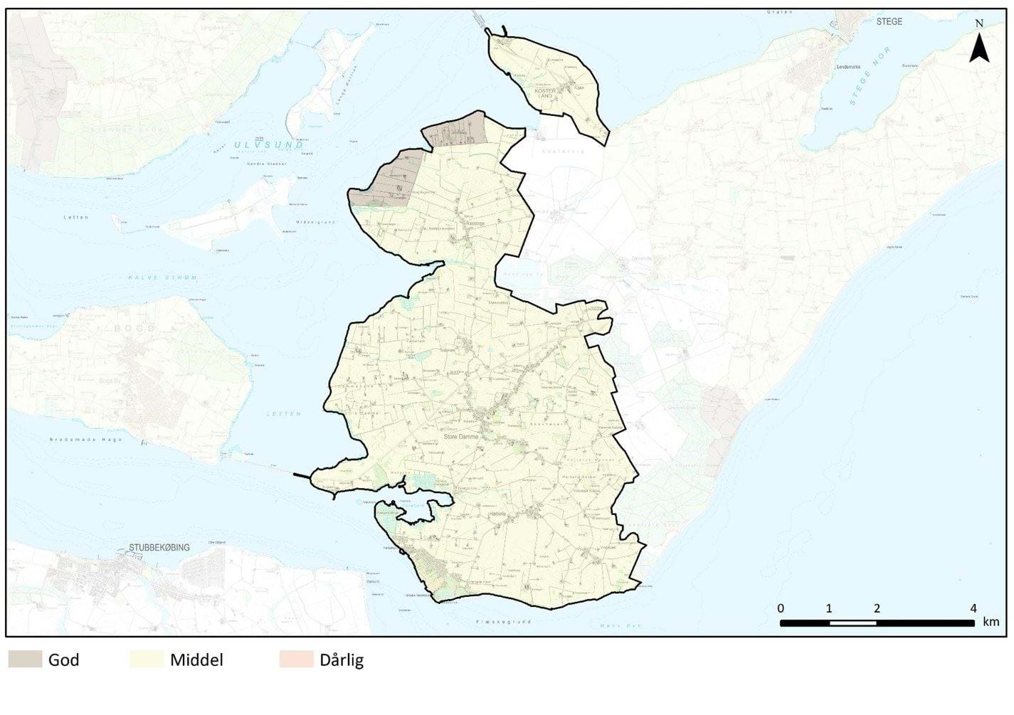 Størstedelen af området opleves som værende i middel tilstand, hvor mange af de oprindelige elementer og strukturer er bevaret, men dog er der løbende sket ændringer. Landsbyerne er blevet fortættet med mindre huse mellem de oprindelige gårde. Store Damme, Askeby og Kokseby er løbende blevet forbundet af bebyggelse og fremstår nærmest som en by. Det er her, der er sket den største byudvikling. Fortætningen er dog sket langs den primære vej gennem bebyggelsen og byerne fremstår derfor fortsat som vejlandsbyer. Ved Hårbølle havn er der kommet et større sommerhusområde til.