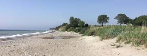 Udsigt fra Stranden ved Ørebæksvej langs Hjelm Bugt mod sydvest. Hvideklint ses langs kysten.