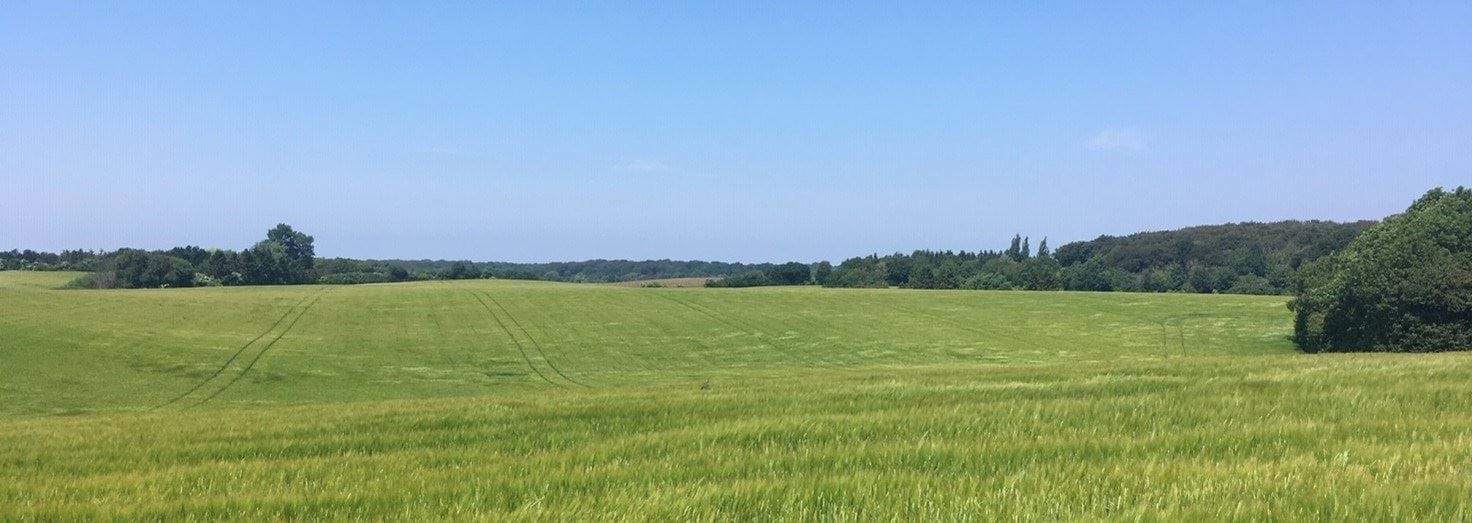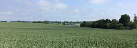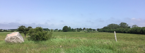 Udsigt fra Søndre Landevej mos øst. Høje Møn rejser sig tydeligt ude i horisonten. Visuel sammenhæng til naboområdet Høje Møn over lavningen omkring Borre.