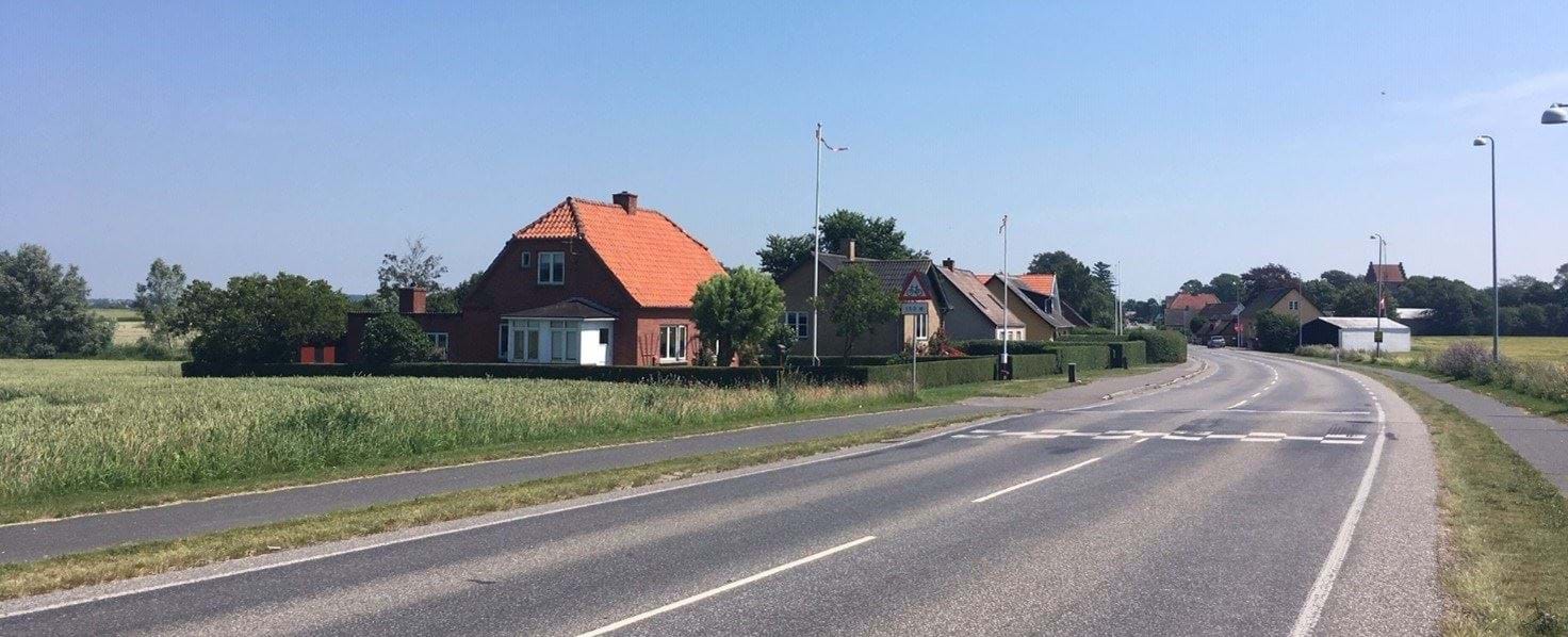 Keldby. Typisk landsby med huse langs vejen.