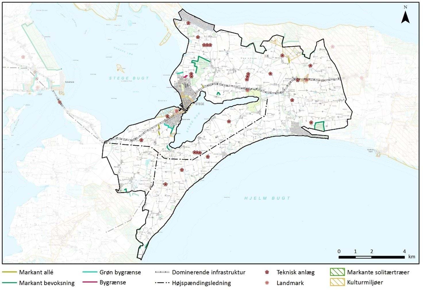 Området er præget af en del vindmøllegrupper, en del enkeltstående husstandsvindmøller, samt et højspændingstracé syd, vest og øst for Stege Nor. Højspændingstracéet virker dog ikke dominerende i området. I den nordlige del af Stege ses et større areal med solceller, ligesom der ses en mindre solcellepark midt mellem Lille Bissinge og Hjelm. Lige syd for Jordbassinerne i ”kanten” af Lendemarke er ligeledes et areal med solceller. Området har kun to telemaster, da de primært er placeret i byzone i Stege. Masterne er placeret hhv. nord for Elmelunde og på Hegnede Bakke. I Stege er den gamle sukkerfabrik domineret af store siloer og skorstene, som opleves som et industrianlæg og et orienteringspunkt i landskabet.
