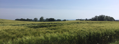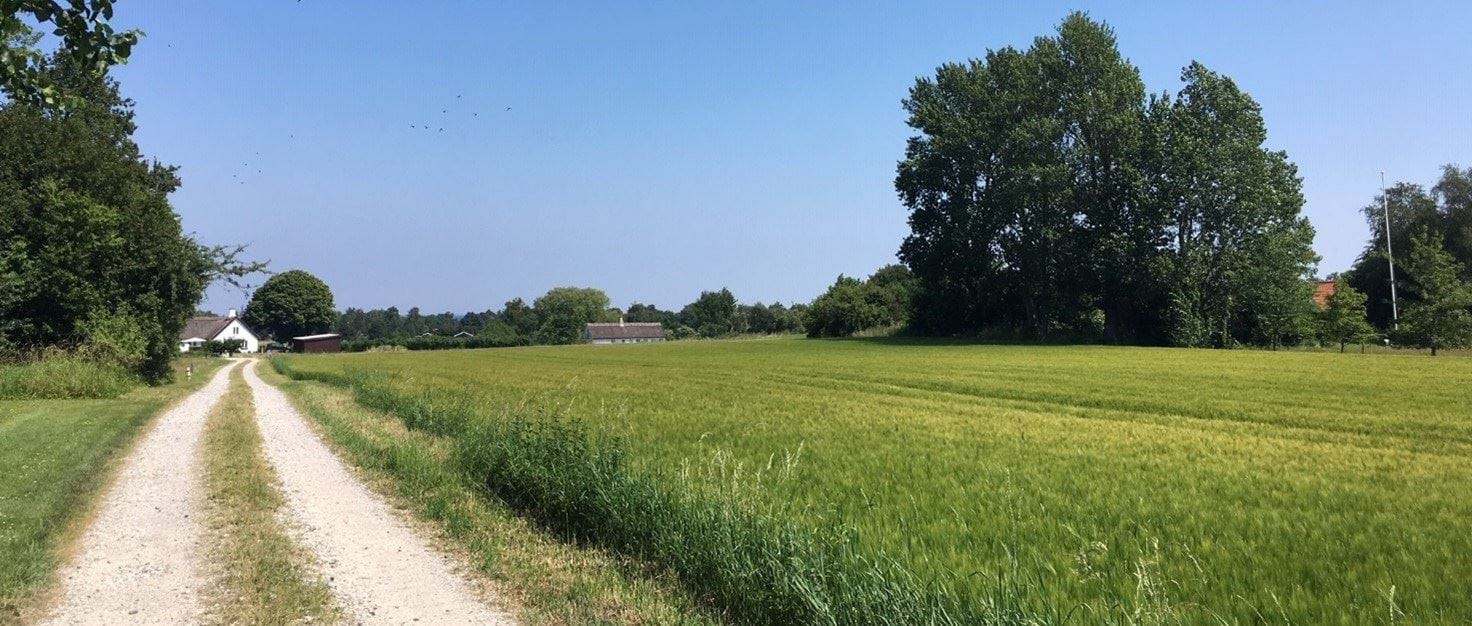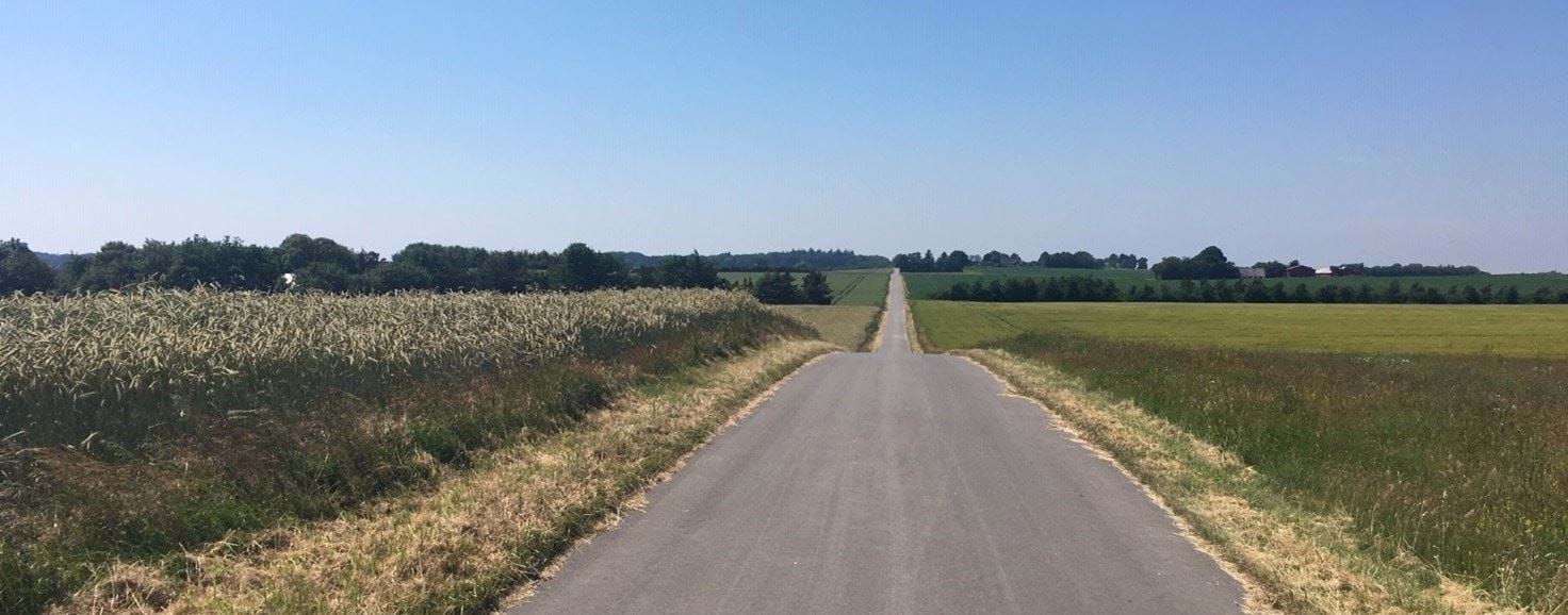 Den lange lige vej, som bugter sig i det bakkede landskab ved blokudstykningen bag Råby Sø. Udstykningens store markfelter ses på begge sider af vejen. Markfelterne er adskilt af levende hegn, som ses på billedet.