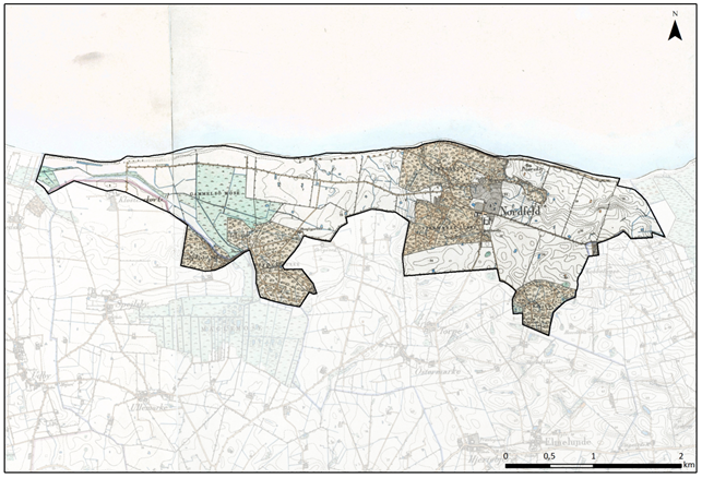 Af Videnskabernes kort fremgår det også at skovene Fredskov, Østermark- og Ridefoged Lukke og Spejlby Skov, er et stort sammenhængende skovområde, hvor der ligger to gårde lige syd for, der formodentligt er Store Oregård og Hegnsgård der ligger i karakterområde 16 Det Midtmønske landbrugslandskab. Det første Nordfeld, der blev bygget i perioden efter år 1774, er desuden angivet på kortet.