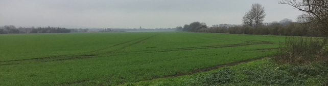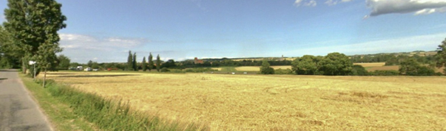 Borre set fra Sønderbyvej - Den tættere beplantning, kirke og betonsiloerne adskiller området fra det mere åbne landskab