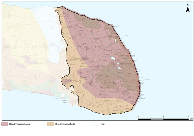 Mod Borrelavningen og sydkysten er området præget af jævnt faldende bundmoræne mod øst og syd, hvor moræneler er den dominerende jordart. Ved sydkysten findes to lavninger i morænen, hhv. øst for klinten ved Kraneled og ved Busene Have, hvor jordbunden er præget af tørv, gytje og marine aflejringer.