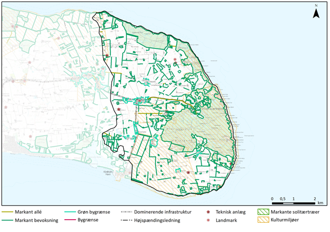 I den sydlige del af området stiger området stejlt mod nord op af de store randmoræner og der er stor udsigt mod syd, øst og vest. Området virker meget åbent, og de læhegn, bebyggelse småskove mv. der findes i området, ser man generelt over, og når man kommer tættere på, er landskabet generelt åbent til siderne og fortsat med store udsigter. Kun tæt på kysten i sydøst er der en del beplantning man ikke kan se over når man er tæt på og samtidig er man her så langt nede i terrænet, at man ikke har udsigt til siderne og skalaen er middel til lille.