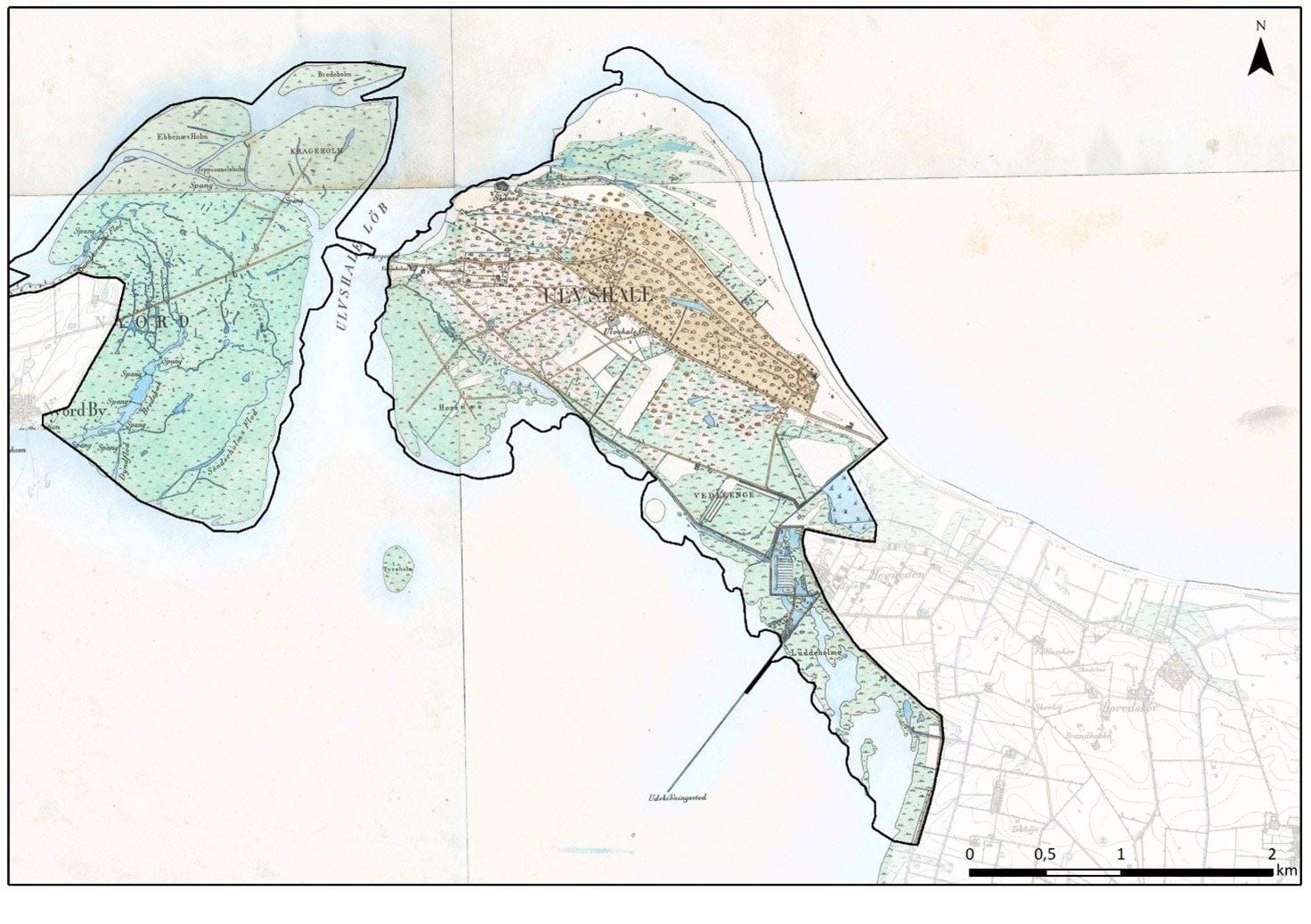 Ulvshalegård, Vogterhuset, skoven og det åbne land: Vidner om den historiske jordbrugsdrift af Ulvshale. Vogterhuset er oprindeligt opført til den der vogtede Udbybøndernes kvæg, mens Ulvshalegård blev opført i 1870’erne som den første og eneste gård der har ligget på Ulvshale. Gården bliver i 1890 købt af Frede Bojsen, der gør den til omdrejningspunktet for driftens af hans jorder og herunder den del af skoven han erhverver. Frede Bojsen præger også det åbne land da han bl.a. står bag dræningen af Vedele Sø. Ulvshaleskoven, der bliver reetableret i midten af 1800-tallet, efter den har været forhugget og bliver fredsskov i 1870, bliver fredet i 1929 som en af de tidligste fredninger i landet, og har siden været drevet som næsten urørt skov.