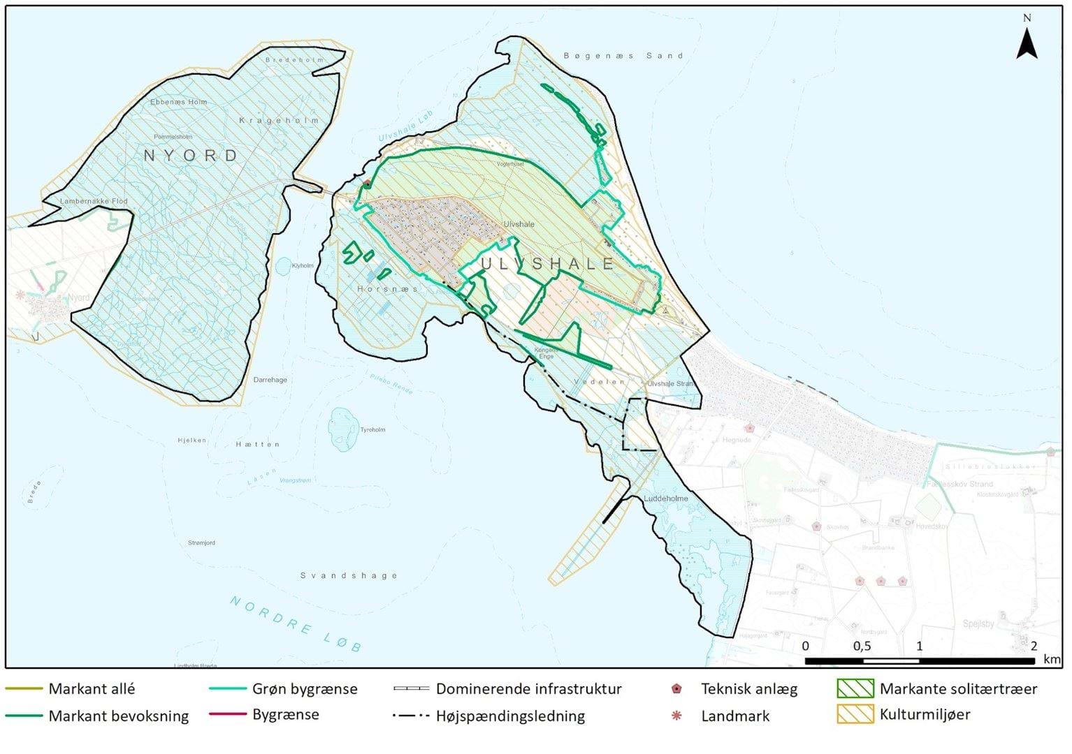 Området er grundlæggende fri for tekniske anlæg, men Ulvshalevejen udgør sammen med broen mellem Nyord og Ulvshale det mest markante tekniske anlæg. Desuden ligger der det lange kystdige på sydsiden af Ulvshale, der udgør et markant element, selvom det ikke er så stort at det bliver dominerende i landskabet.