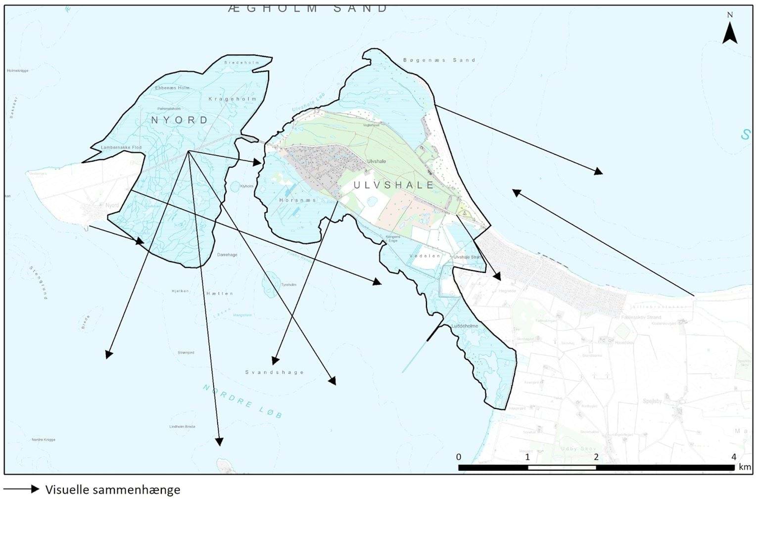 Strandengene på Nyord ligger lavt i landskabet, og det hævede terræn på Nyord blokerer i høj grad for udsigten mod vest, men der er god kontakt til karakterområde 8 Kystlandskab ved Sandvig Kragevig og Nyord, særligt fra fugletårnet placeret midt på strandengene i tilknytning til vejen. På Ulvshale blokerer Ulvshaleskoven og sommerhusområdet i høj grad for udsigten på tværs af karakterområdet, men fra den nordlige del af Ulvshale er der udsigt til de nordøstlige karakterområder på Østmøn - 16 Det Midtmønske landbrugslandskab, 17 Nordfelt godslandskab, 18 Borrelavningen og 19 Høje Møn. Fra den sydlige del af Ulvshale og Nyord er der visuel sammenhæng med store dele af karakterområde 16 Det Midtmønske landbrugslandskab.