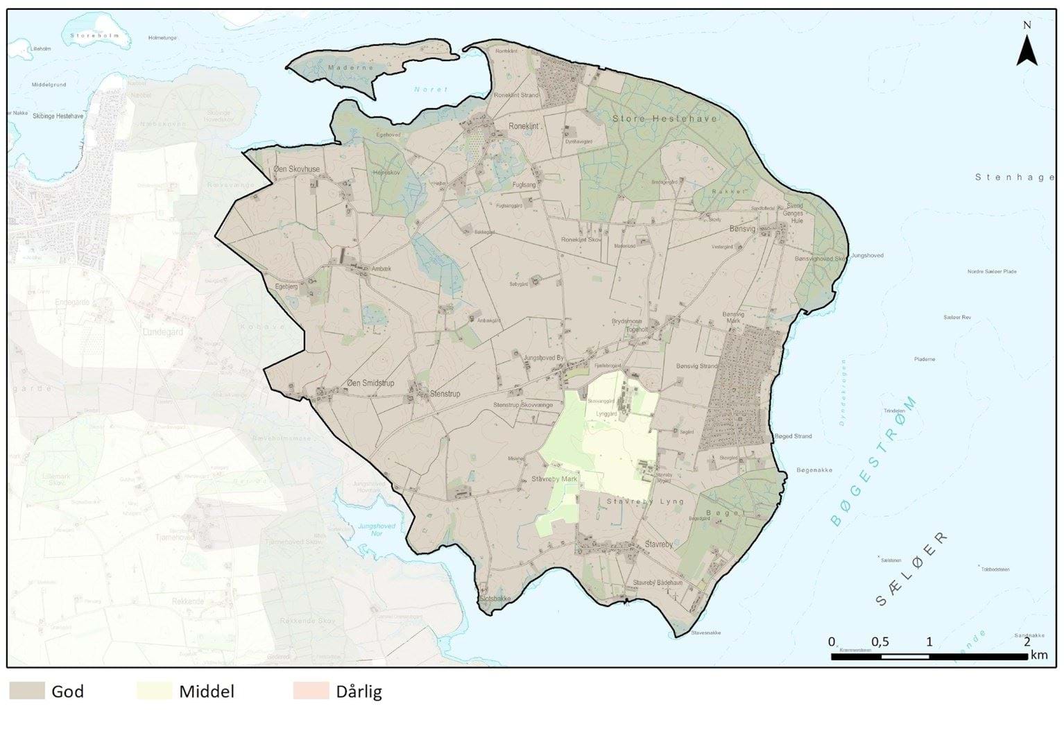 Området er generelt i god tilstand, da de karaktergivende landskabselementer, i form af bebyggelsesstruktur, marker, levende hegn, skovbryn og naturarealer, fremstår intakte. Bygningsmassen er de fleste steder stadig velproportioneret i forhold til områdets skala, og landskabet er kun i mindre grad påvirket af tekniske anlæg. De få tekniske anlæg omfatter for eksempel vindmøllerne ved Bøged, som er ældre og derfor med deres begrænsede størrelse ikke virker meget dominerende.