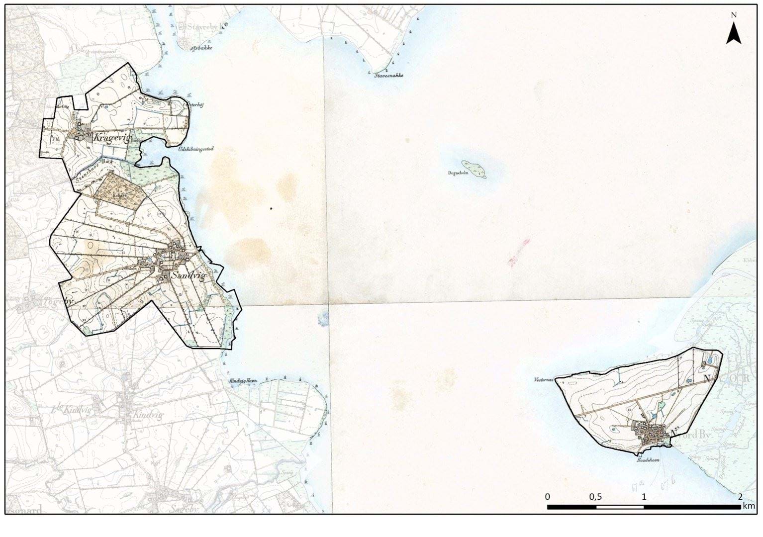 Om Sandvig ses den klare struktur givet af markfelternes stjerneformation, men her tydeligt markeret med de levende hegn i skellene.