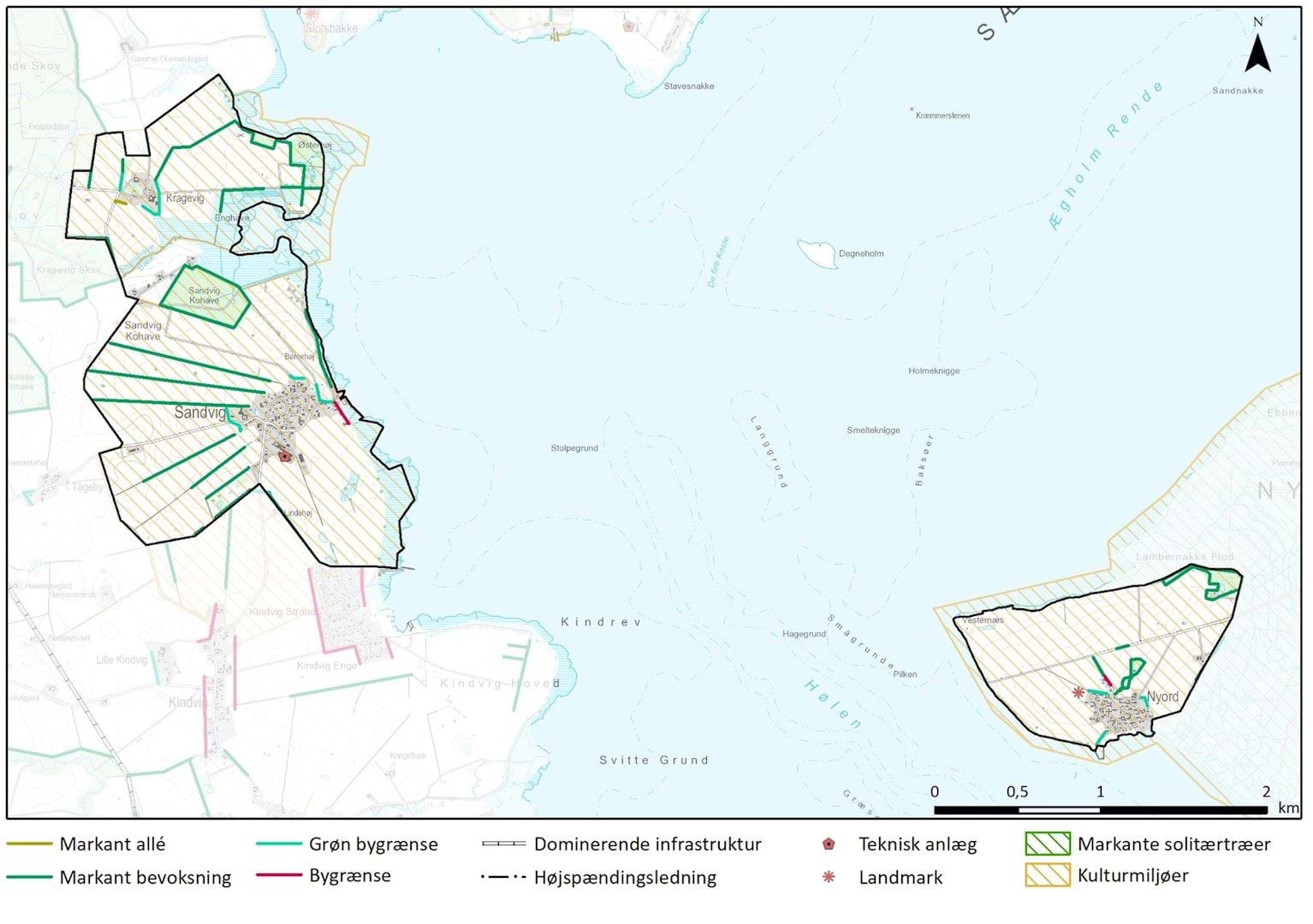 I området ved Sandvig/Kragevig er skalaen middel, da skovbryn, beplantede diger, levende hegn og bevoksninger giver klare afgrænsninger. Fra enkelte højtliggende steder i området får beplantningselementerne mindre betydning, da der er udsyn hen over dem og ud til Bøgestrømmen. Landskabet er her mere sammensat end på Nyord, med flere typer af karaktergivende landskabselementer.